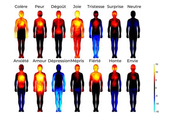 Des chercheurs ont étudié les liens entre les émotions et les sensations physiologiques et ils ont révélé des patterns de sensations physiologiques spécifiques associés aux différentes émotions. Une méthode scientifique d’auto-évaluation topographique a permis de décrire les association entre émotions et sensations corporelles. En clair, les personnes ont noté ce qu’elles ressentaient dans leur corps lorsqu’elles faisaient l’expériences de certaines émotions. Dans cinq expériences, 700 participants de divers pays ont contribué à cette étude en décrivant leurs sensations corporelles lors d’expériences émotionnelles. Les résultats ont montré que chaque émotion était systématiquement associée à des schémas de sensations physiologiques distincts.